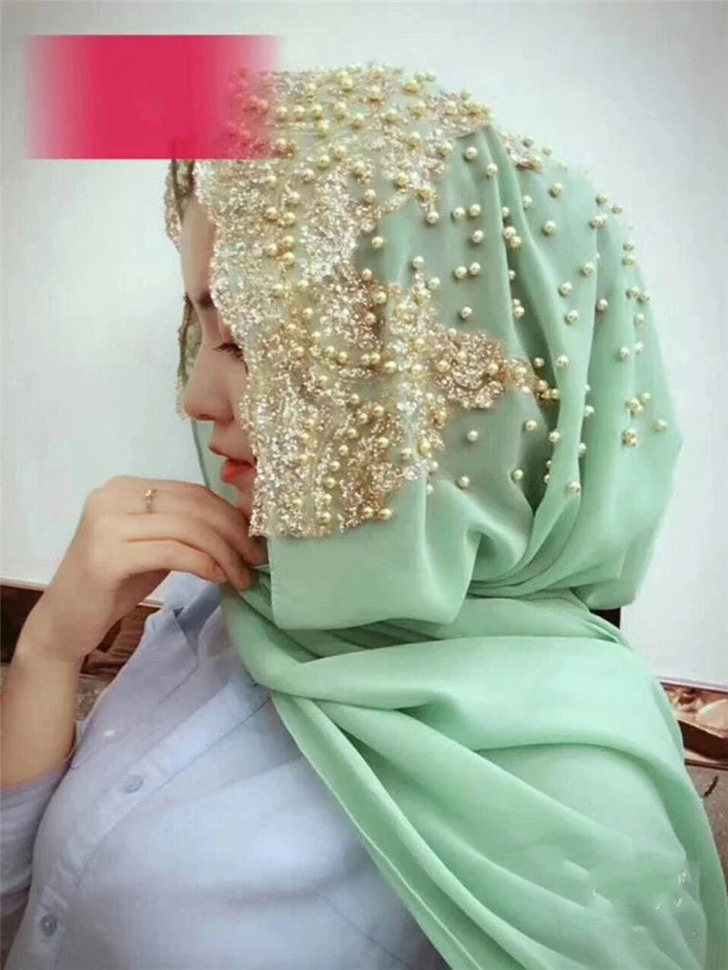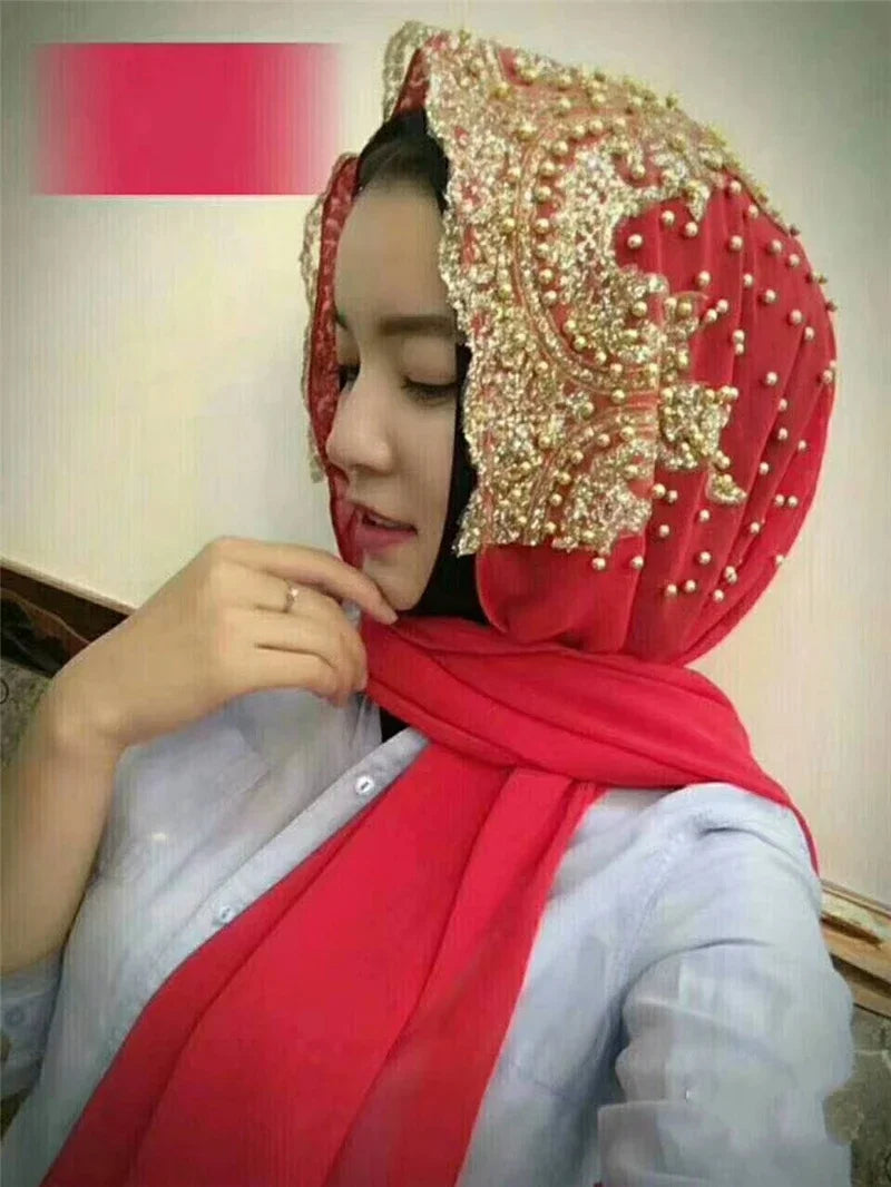 Dubai Women Bling Beaded Headscarf Long Scarf Cap Lace Scarves Muslim Wedding Wrap Shawls Hijab Islamic Turban