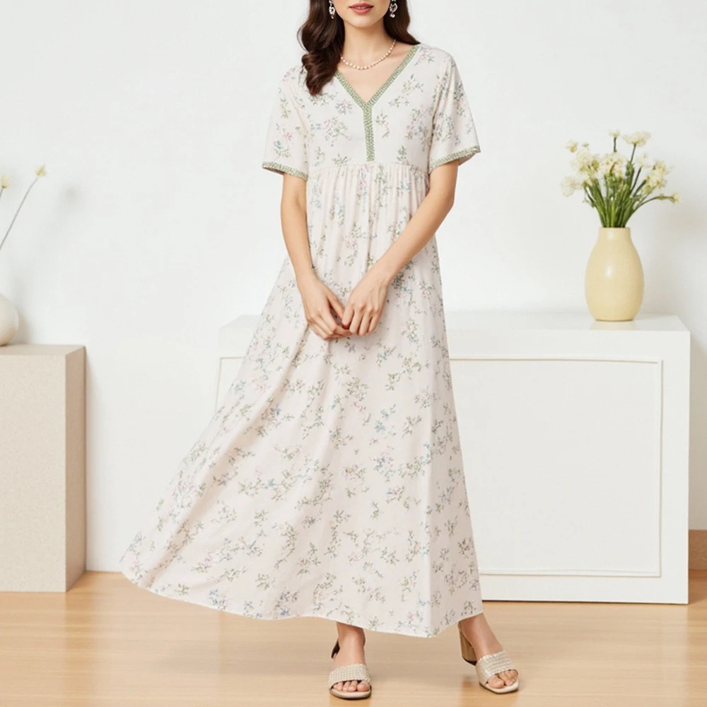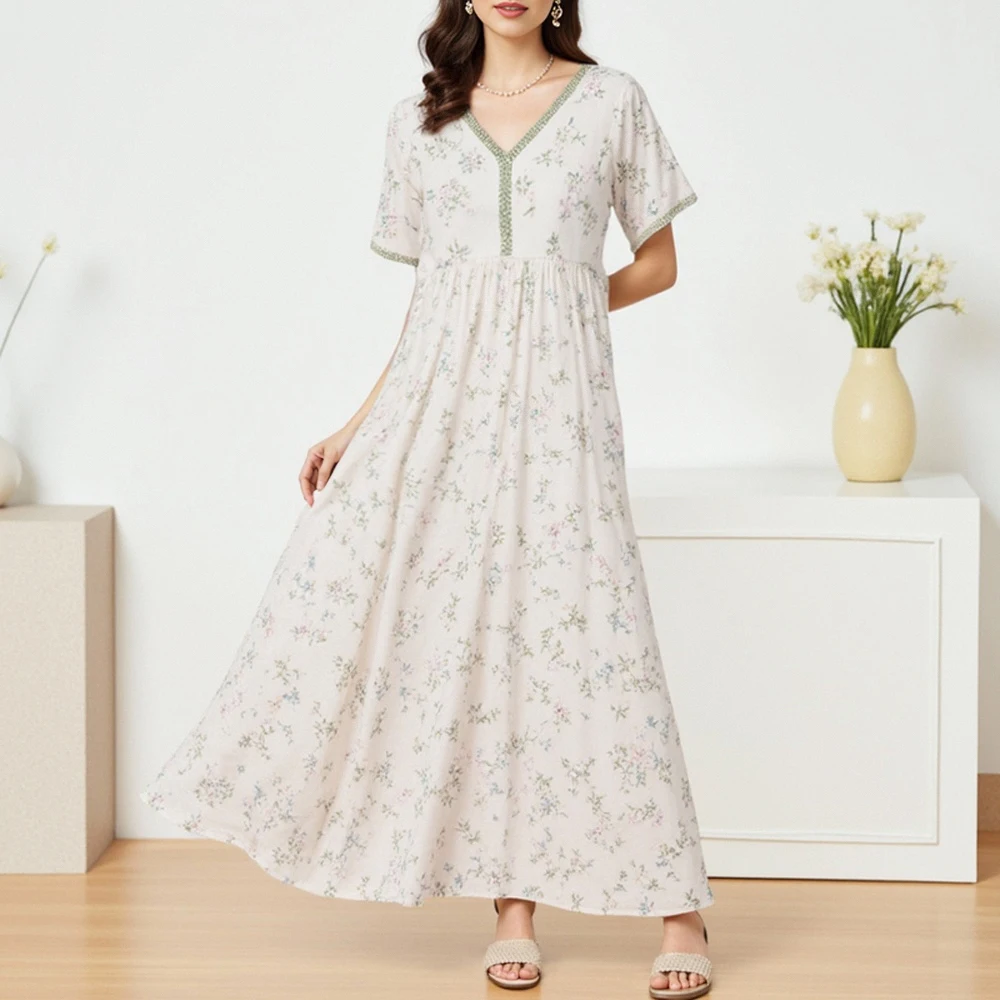 Rafiah Autumn Arabian Long Dress 2025 Casual Daily Ditsy Floral Short Sleeve V-Neck A-Line Dress For Women