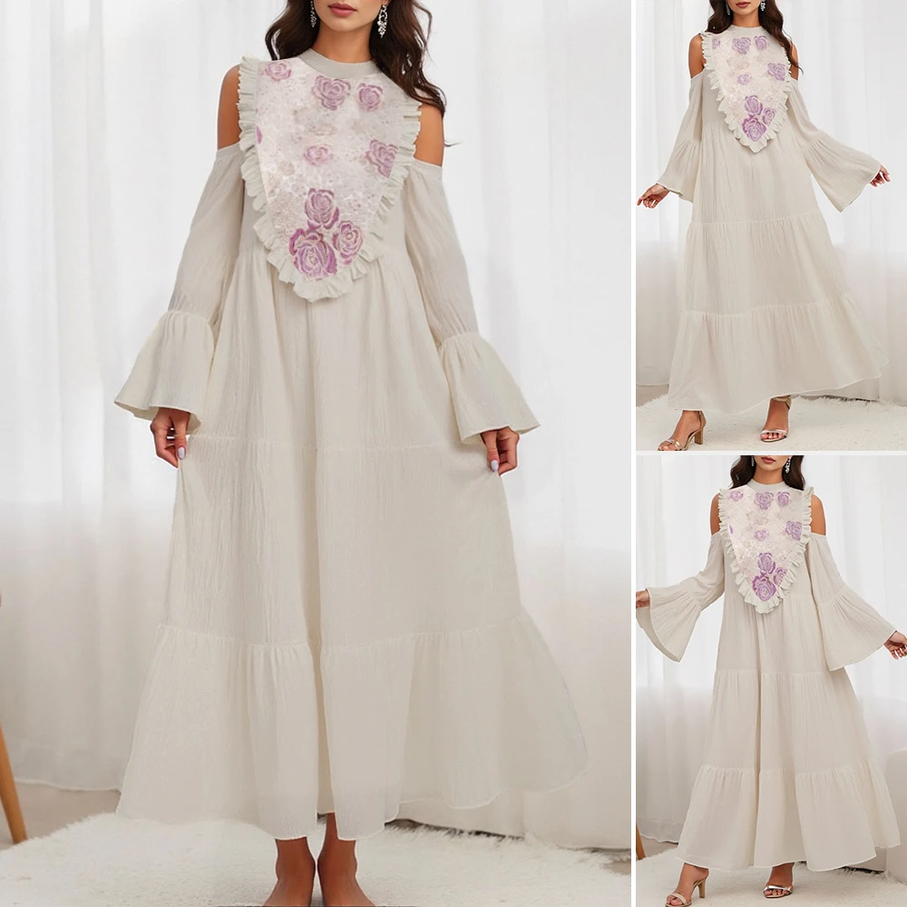 Rafiah Autumn Arabian Long Dress 2025 Cute Chic Flounce Floral Flare Sleeve Mock Neck A-Line Long Dress For Women