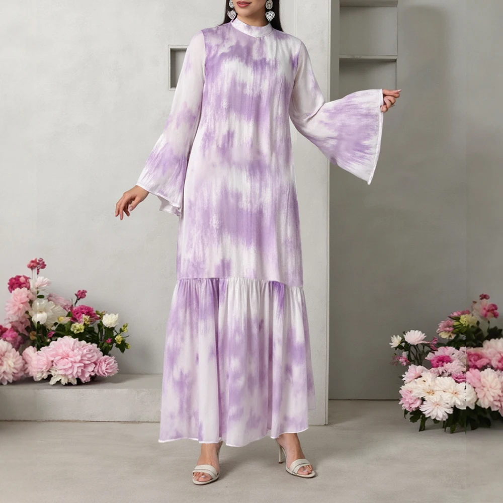 Rafiah Autumn Women's Arabian Dress 2025 Elegant Basics Contrast Color Long Sleeve Round-Neck Ruffle Hem Long Dress