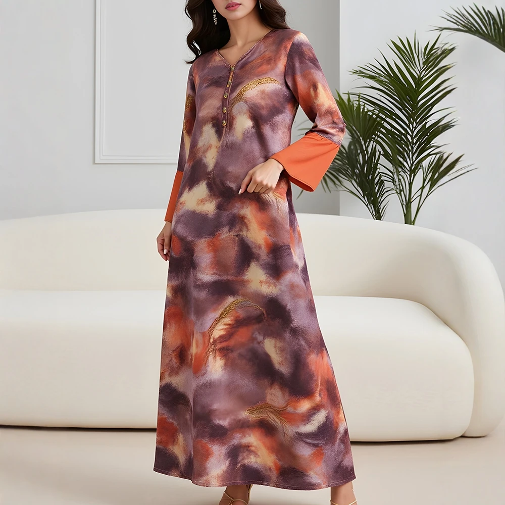 Rafiah Dress Spring Summer Elegant Modest Fashion Tie Dye Long Sleeve V-Neck Maxi Evening Dresses