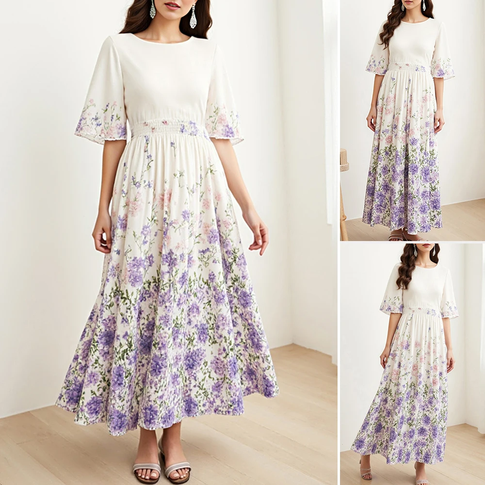 Rafiah Summer Arabian Dress 2025 Women's Decent Flower Full Print Folds Short Sleeve Round-Neck Daily Basic Midi Dress