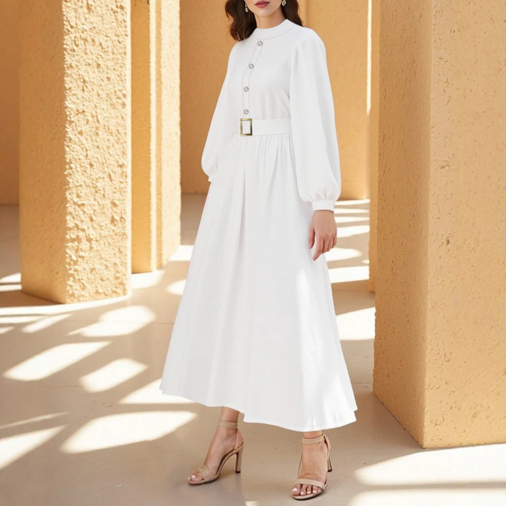Rafiah Summer Dress 2025 Women's Decent Plain Long Sleeve Crew Neck High Waist A-Line Office Lady Long Arabian Dress