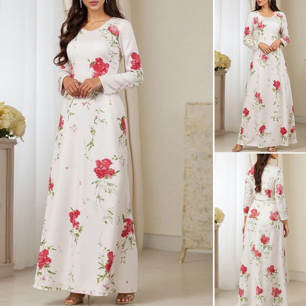 Rafiah Women's Arabian Dress Autumn Winter 2025 Elegant Fashion Floral Full Print Long Sleeve V-Neck Arabian Dress For Women
