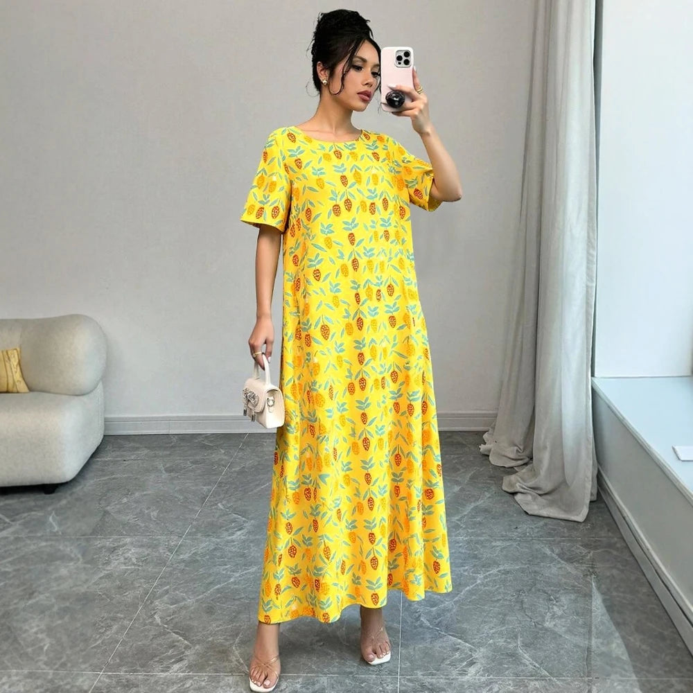 Rafiah Women's Arabian Dress Summer Cute Daily Cartoon Full Print Short Sleeve Round-Neck Midi A-Line Long Casual Dress