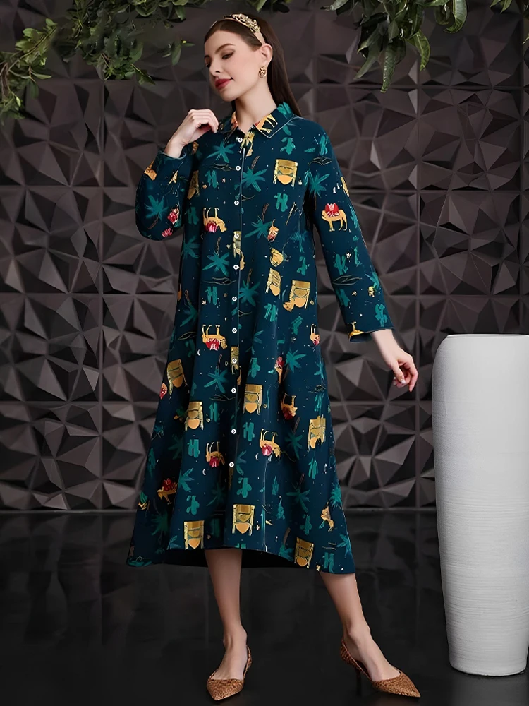 Rafiah Women's Dresses Summer Comfortable Elegant 2025 Cartoon Long Sleeve Shirt Collar A-Line Midi Vacation Long Dresses