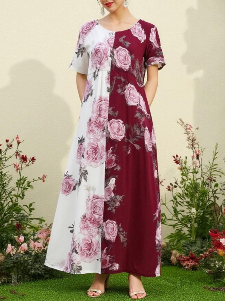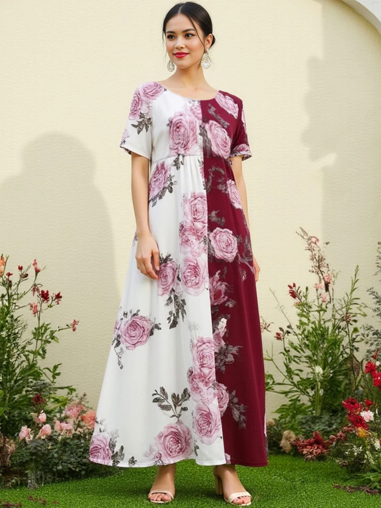 Rafiah Women's Dresses Summer Daily Comfortable Floral Patchwork Short Sleeve Crew Neck Midi Long Dress Loose Fit Shift Dresses