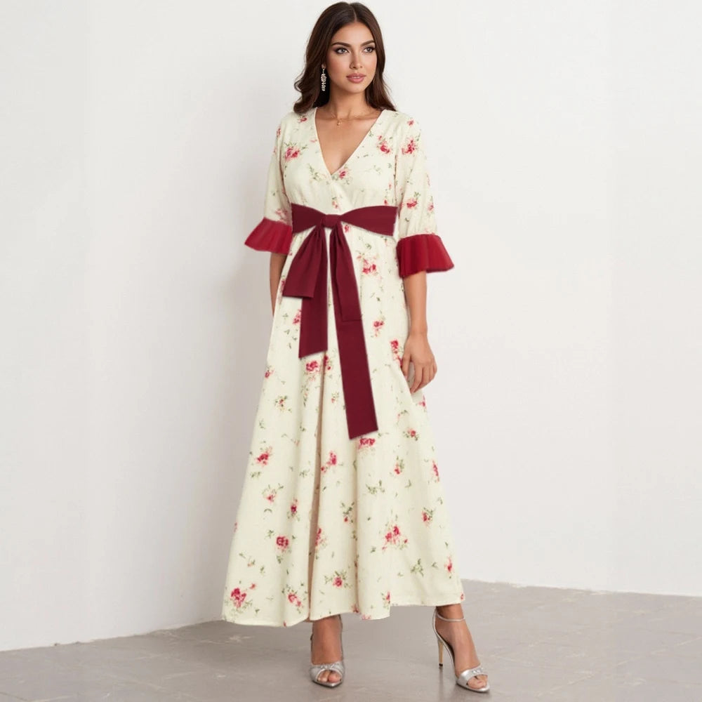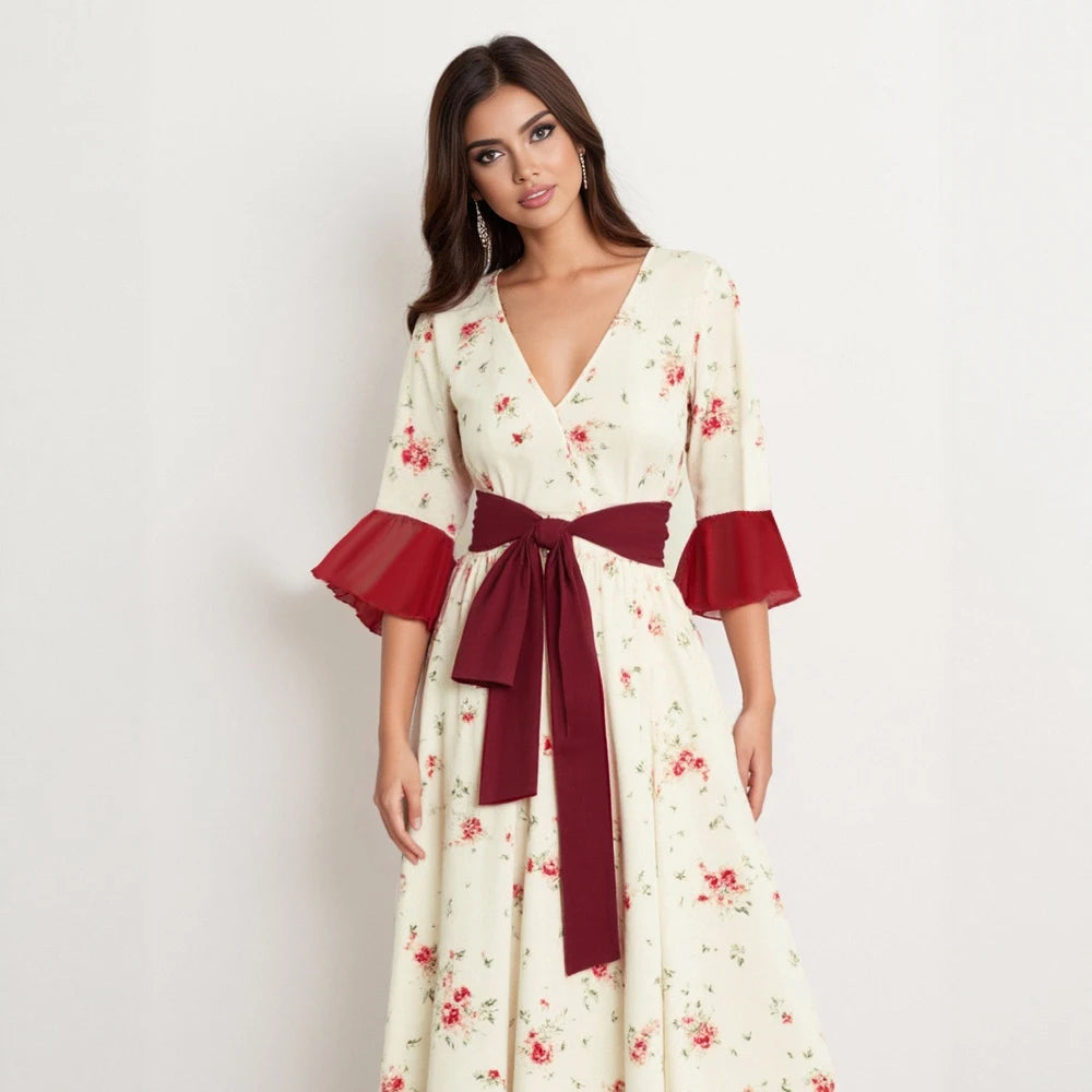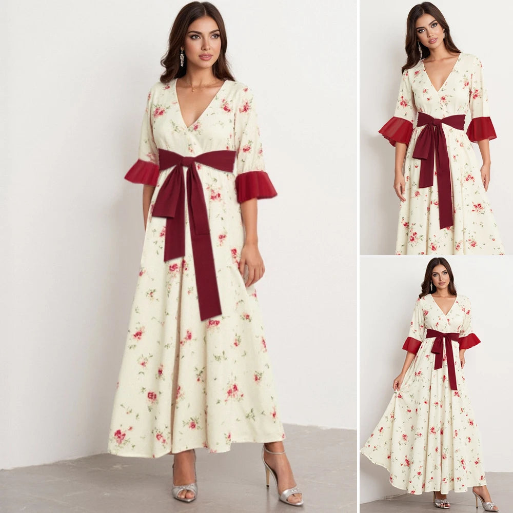Rafiah Women's Dresses Summer Elegant 2025 Bowknot Glamorous Short Sleeve V-Neck A-Line Midi Vacation Long Dresses