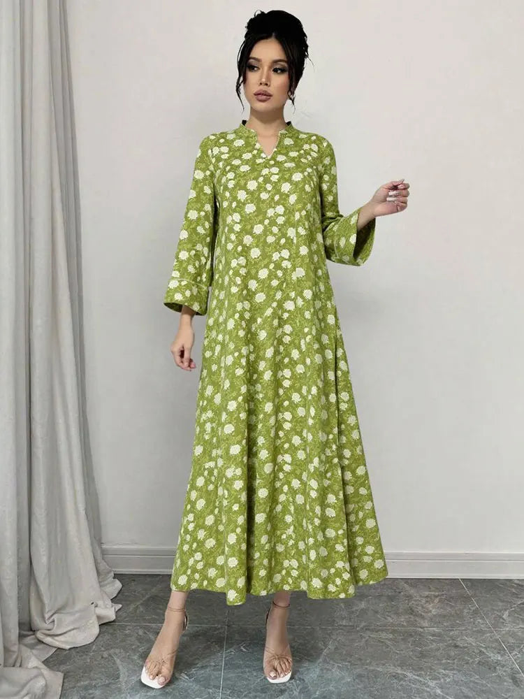 Rafiah Women's Even Dress Arabian 2025 Summer Chic Full Print Long Sleeve Half Open Collar Midi Draped Long Dress