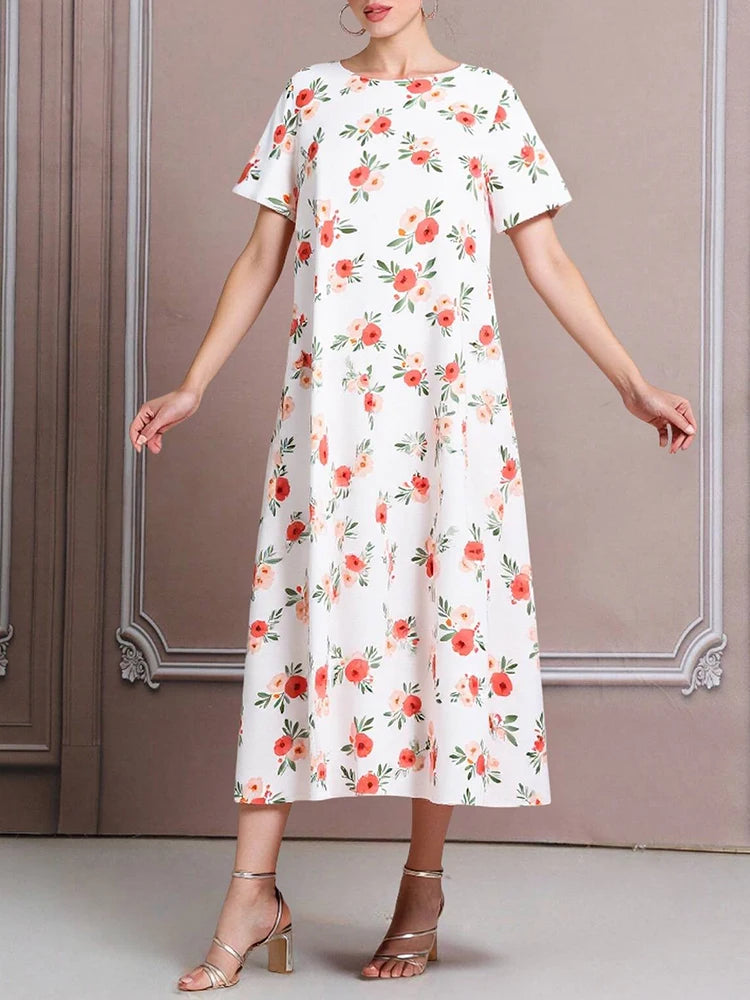 Rafiah Women's Even Dress Arabian 2025 Summer Elegant Contrast Color Full Print Short Sleeve Round-Neck Draped Long Dress