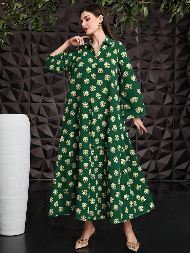 Rafiah Women's Even Dress Arabian 2025 Summer Modest Fashion Full Print Long Sleeve Lapel Midi Loose Fit Long Dress