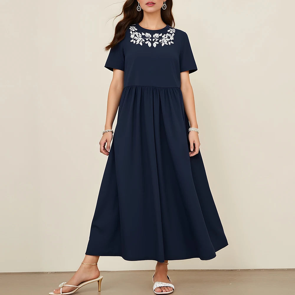 Rafiah Women's Summer 2025 Dress Solid Color V-Neck Floral Embroidered Short Sleeve Relaxed Silhouette Long Dress