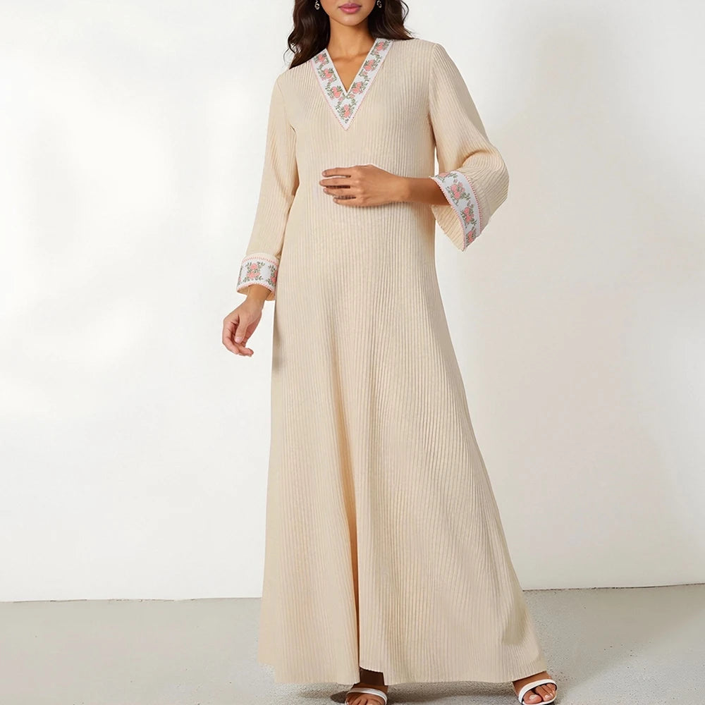 Rafiah Women's Summer 2025 Dress Solid Color V-Neck Striped Floral Embroidery Relaxed Silhouette Long Dress