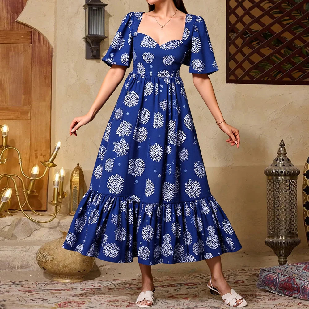 Rafiah Women's Summer Long Arabian Dress Chic Daily Full Print Short Sleeve Sweetheart Neck Midi A-Line Shift Dresses