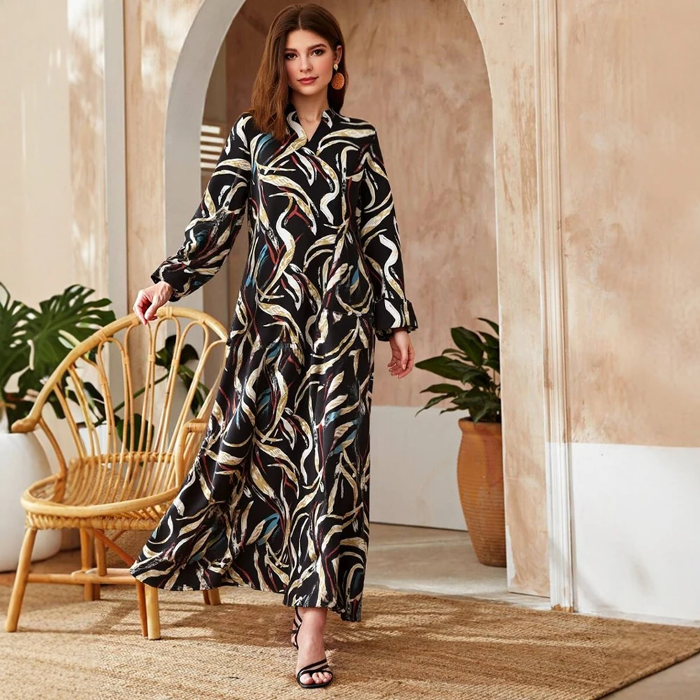 Rafiah Women's Summer Long Arabian Dress Chic Daily Irregular Grain Full Print Long Sleeve V-Neck Midi Loose Fit Dress