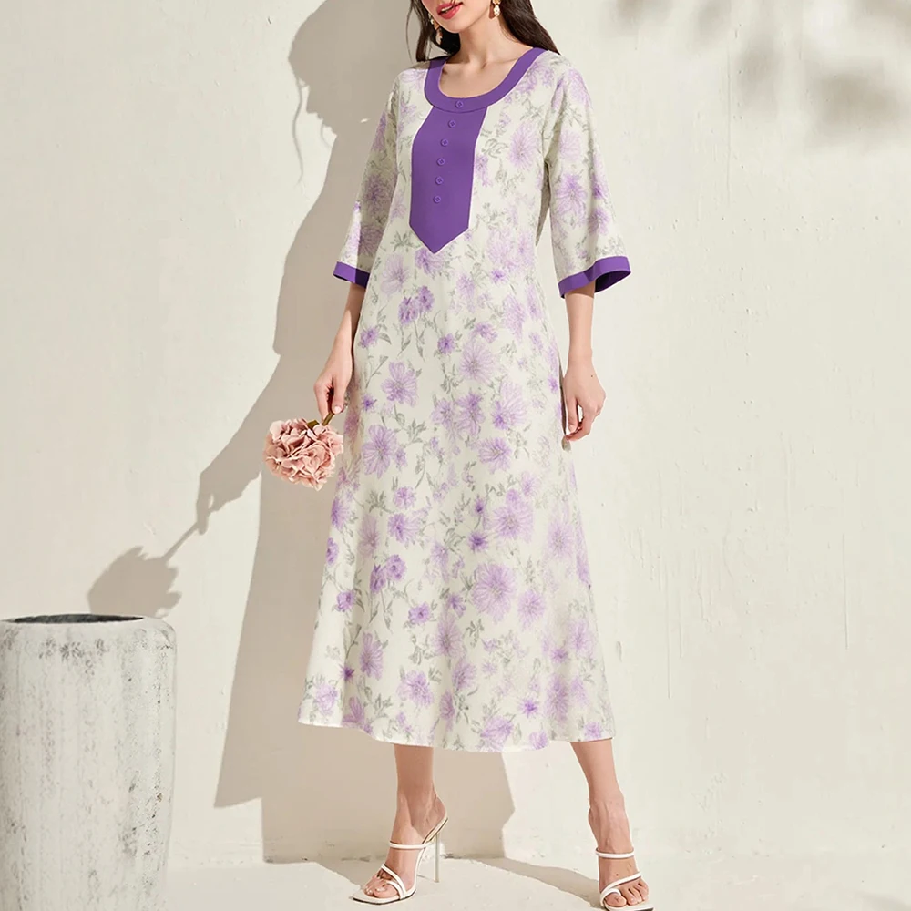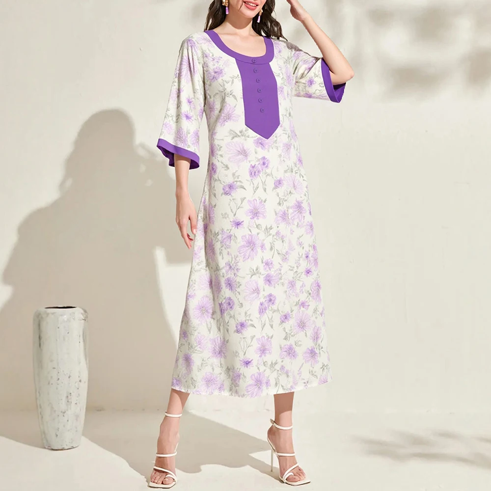 Rafiah Women's Summer Long Arabian Dress Traditional Contrast Color Floral Short Sleeve Round-Neck Single Breasted Midi Dress