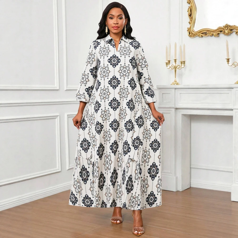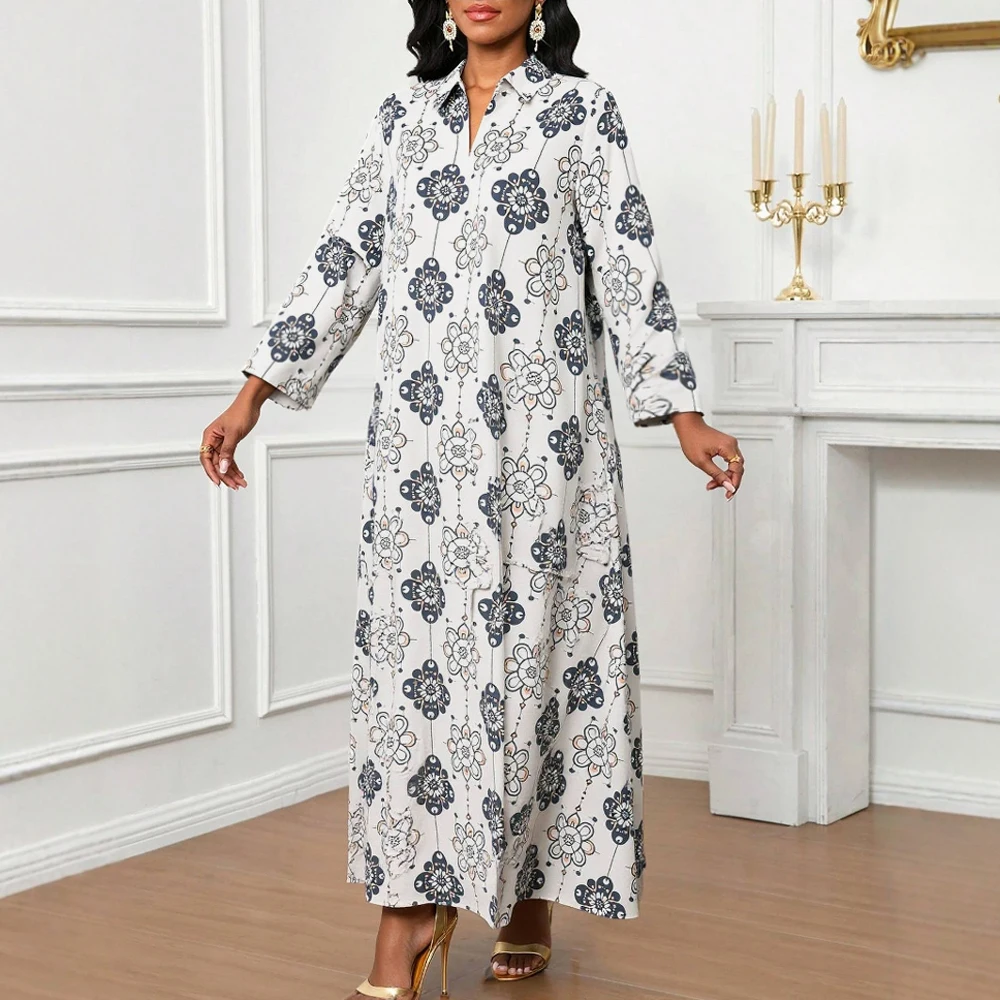 Rafiah Women's Summer Long Dress 2025 Arabian Dress Elegant V-Neck Long Sleeve A-Line Maxi Full Print Casual Dress
