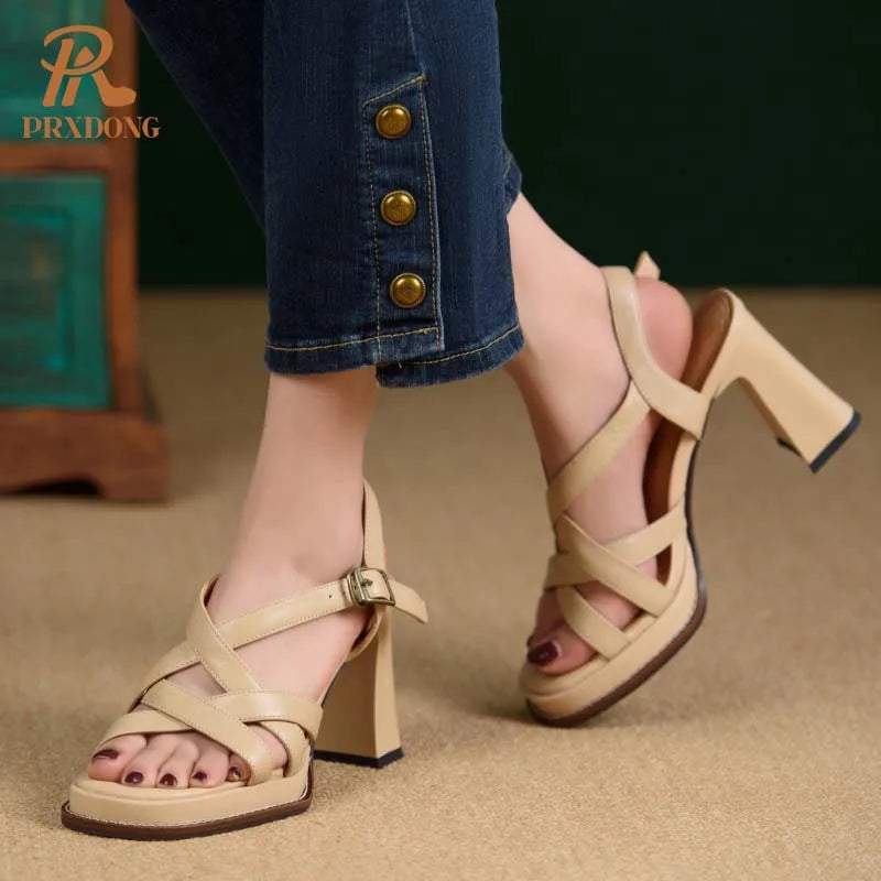 Elevate your summer style with these GrabliWorld women's genuine leather chunky high heel platform sandals. Designed with an elegant retro flair, these black and beige sandals feature an 8.5cm super high square heel and a comfortable 0-3cm platform for balanced height and stability. The open side vamp and front & rear buckle straps offer a secure fit, while the geometric pattern adds a chic touch perfect for parties, weddings, and dressy occasions. Crafted with premium cow leather uppers and synthetic lining, these sandals fit true to size and provide lasting comfort with a bonded leather insole and durable rubber outsole.