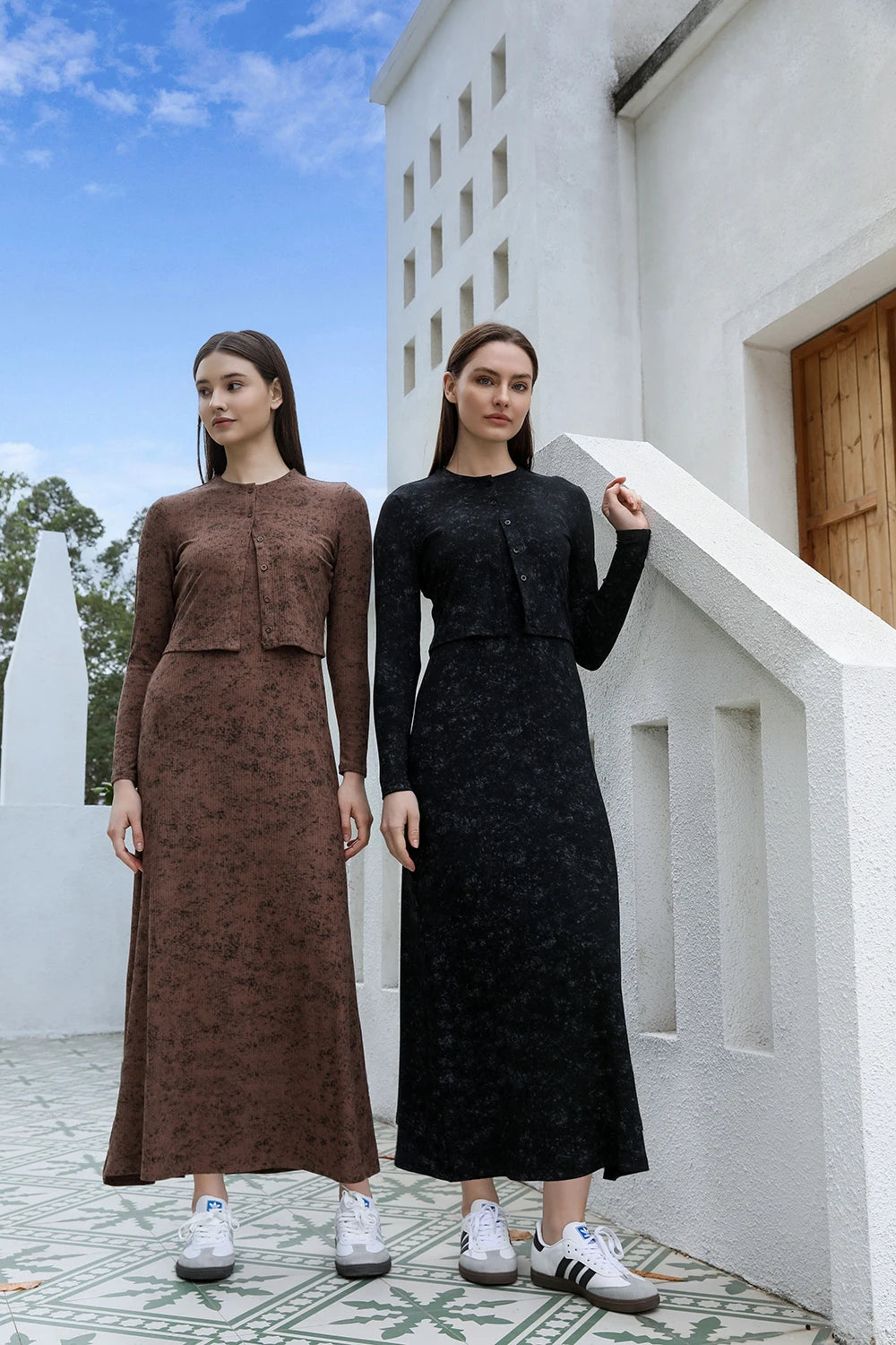 The AP SS2025 Women Rib Tie Dye Cardigan & Dress Set is a stylish and versatile two-piece designed for modern spring and summer wear. Made from a soft cotton-spandex blend with medium stretch, this set includes a tie-dye ankle-length dress with an A-line silhouette and a matching ribbed knit cardigan with button closure.