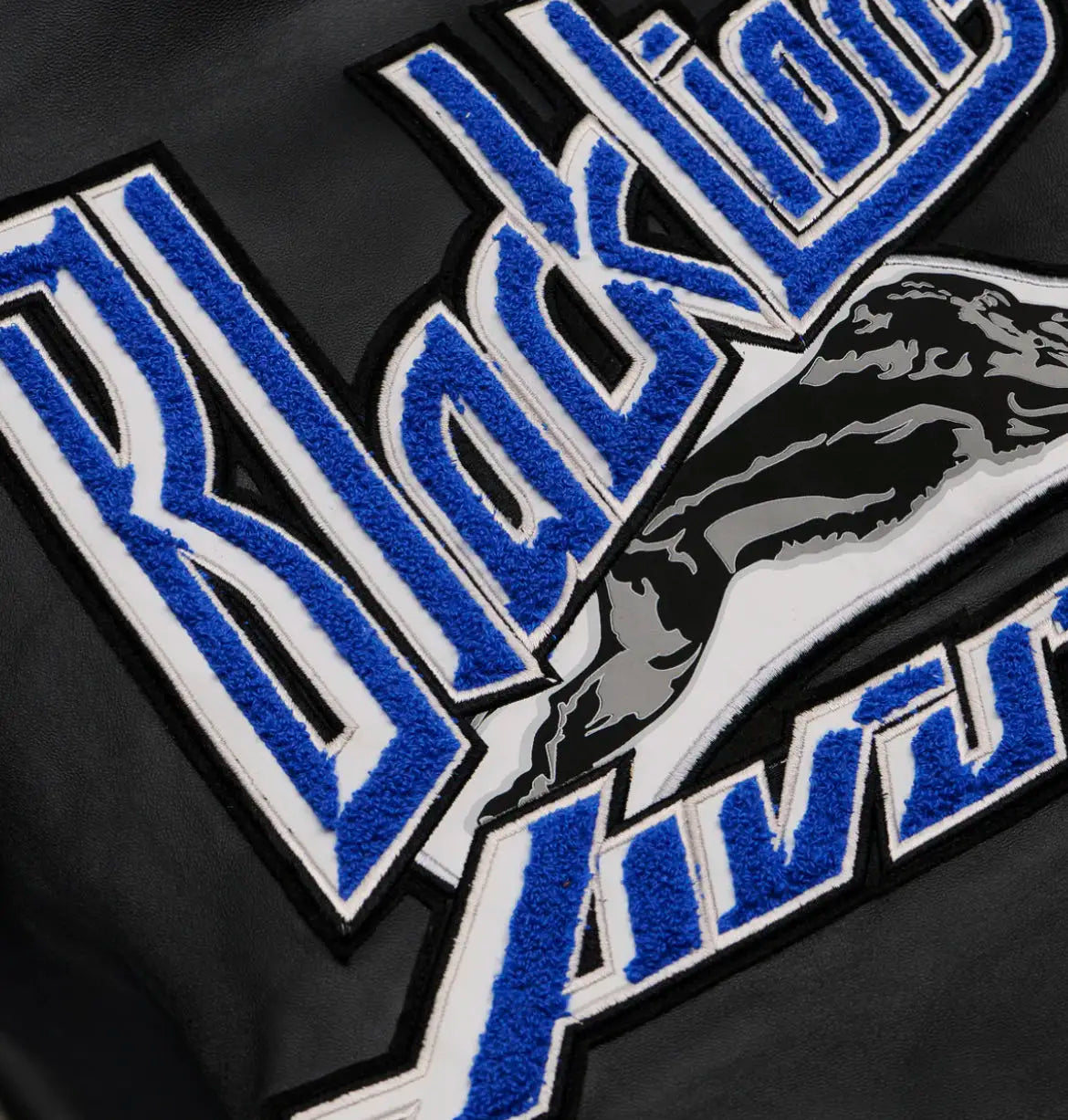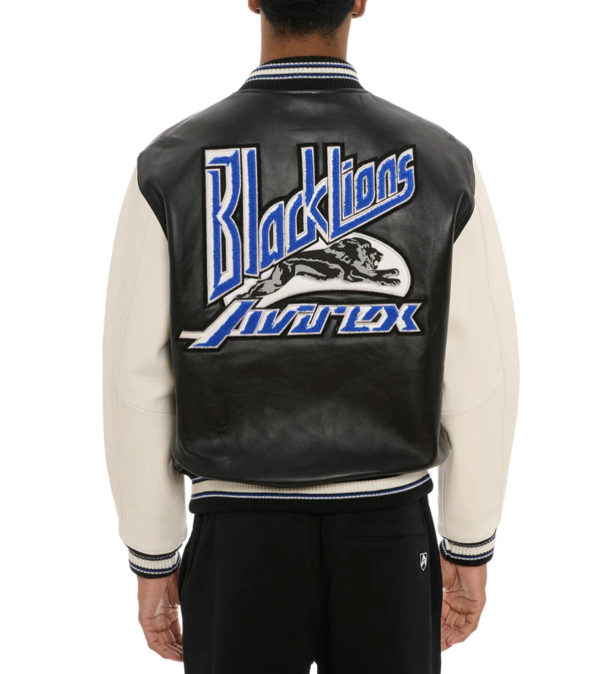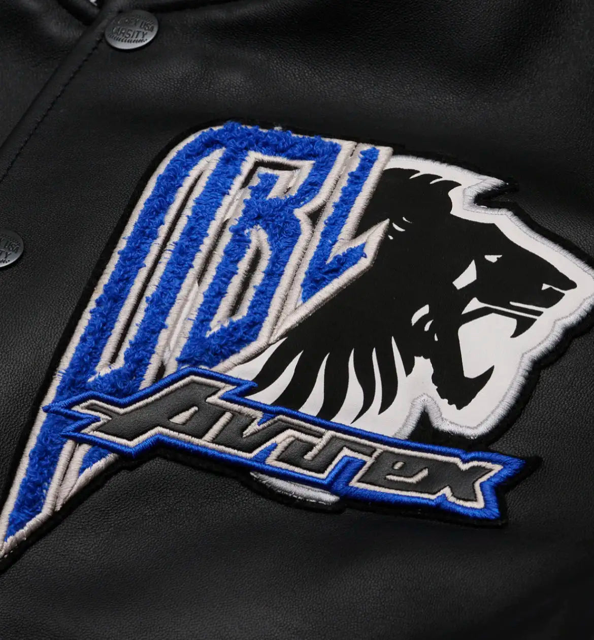 Classic USA varsity jacket in 100% antique European lamb leather with USA and flag appliques on back and varsity flag chenille patch on front chest.
