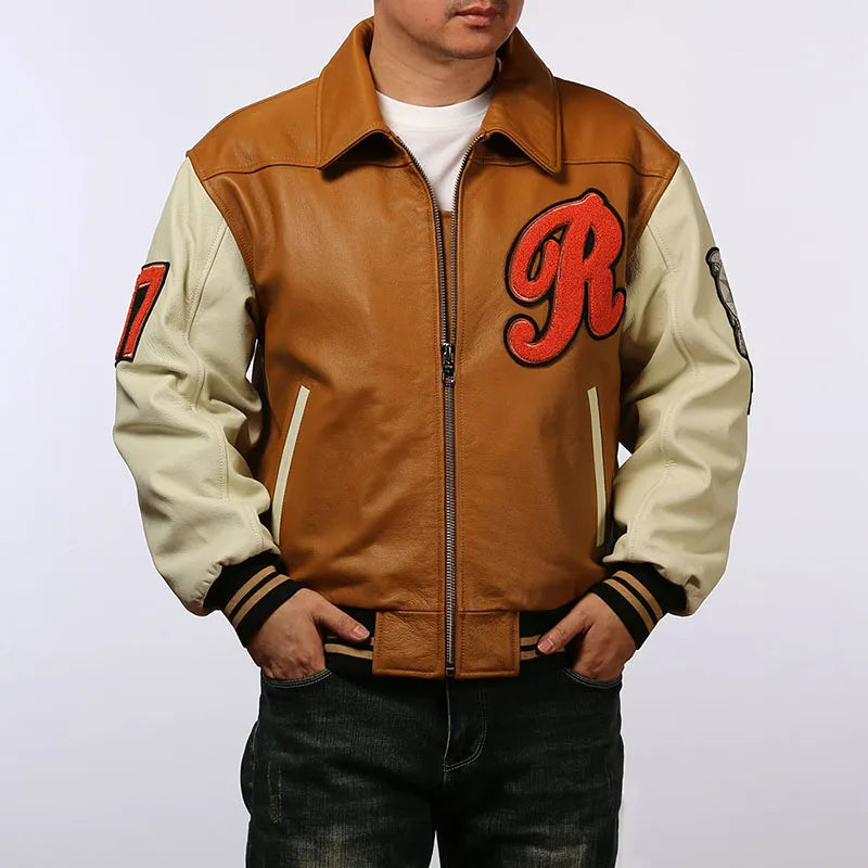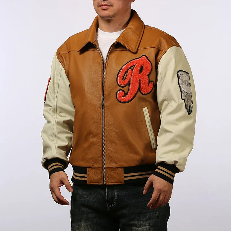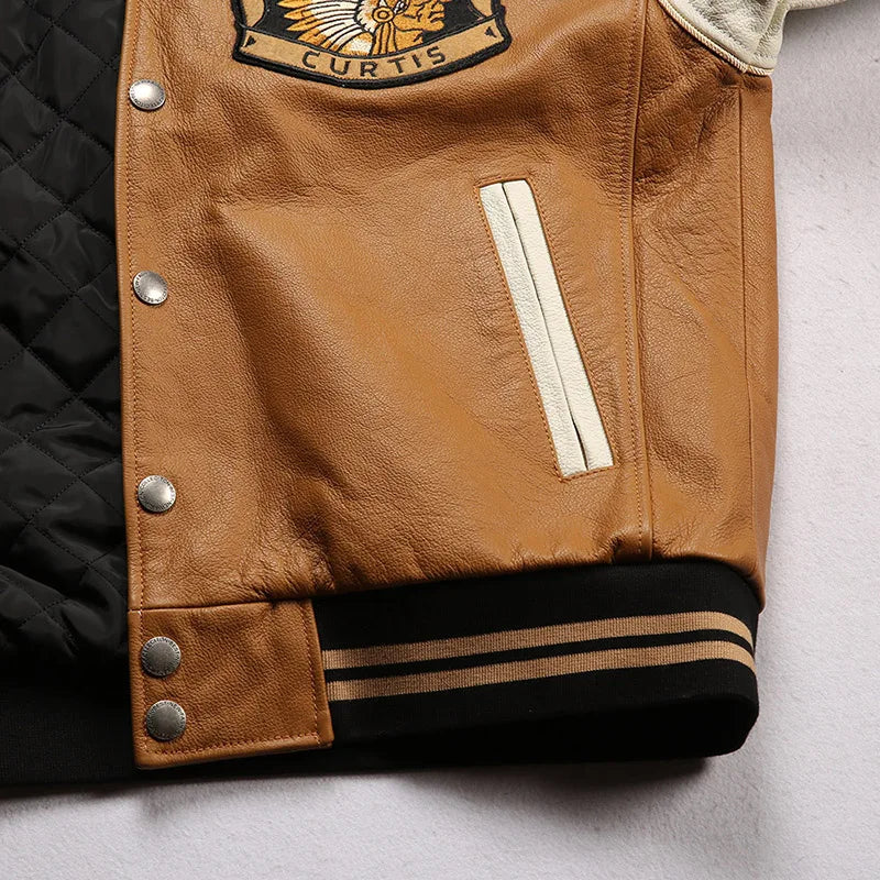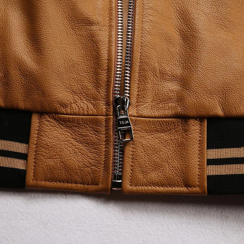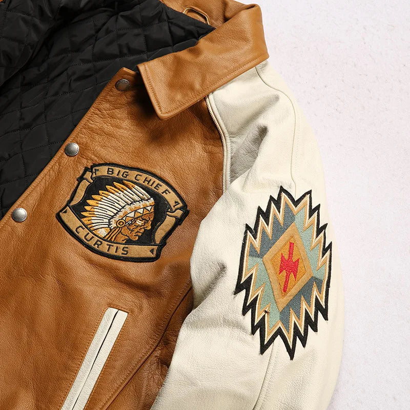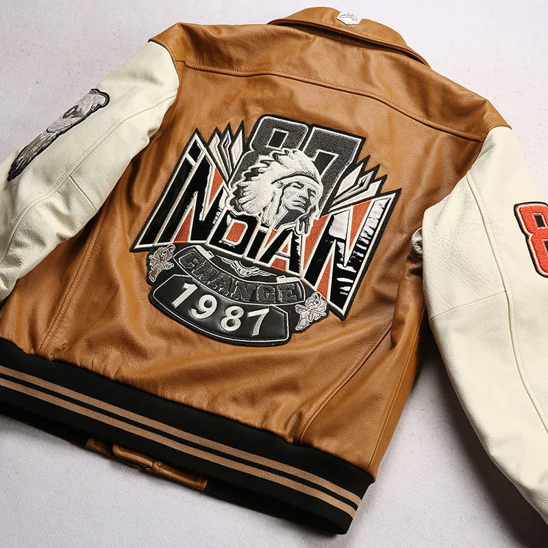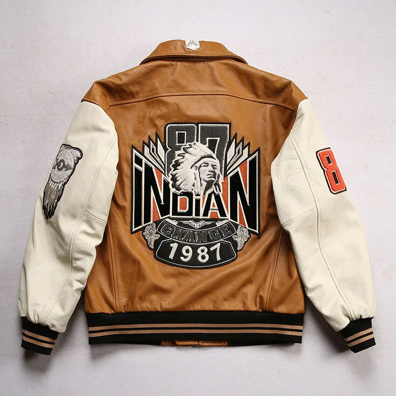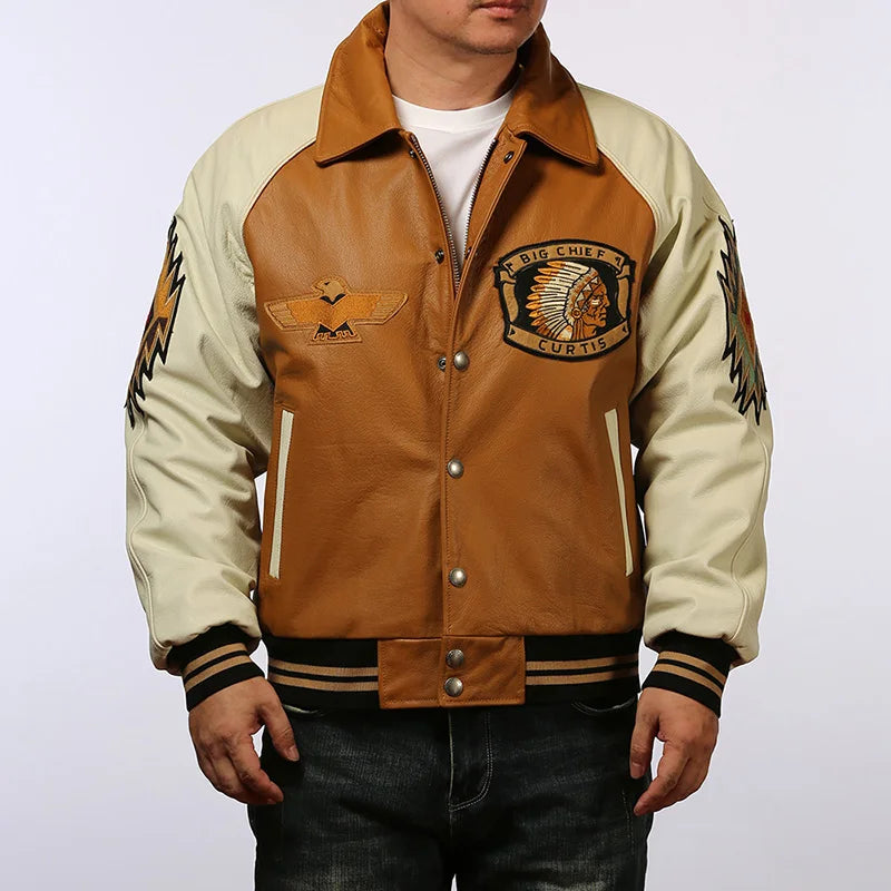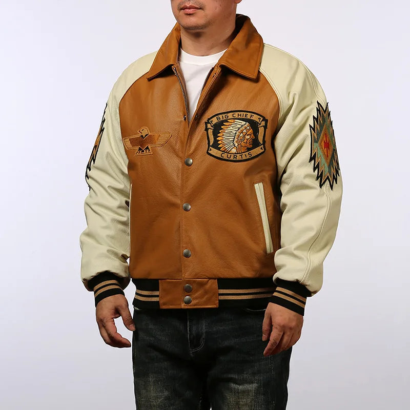 Men large size leather jacket flight suit jacket printed big chief embroidery casual sports yellow cowhide leather jackets tops