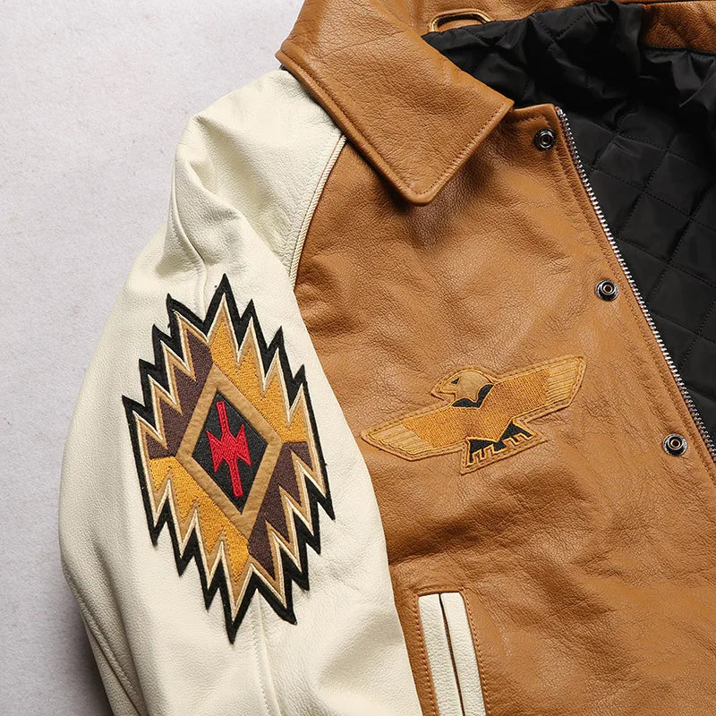 Chest American eagle, and Indian big chief embroidery. Navajo totems on either side of the arms. Strong sense of history.