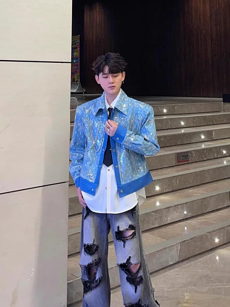 Mens Blue Denim Jacket Fashion Sequined Chain Turn-Down Collar Spring Autumn Short Coat Single Breasted Casual Outerwear Male