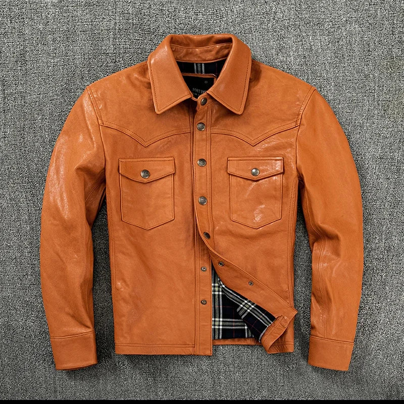 Step into modern fashion with this Korean Style Men’s Sheepskin Leather Jacket, a sleek and versatile piece crafted from premium pure sheepskin leather. Designed with a slim-fit cut and short shirt-style length, this jacket blends trendy streetwear with timeless sophistication.