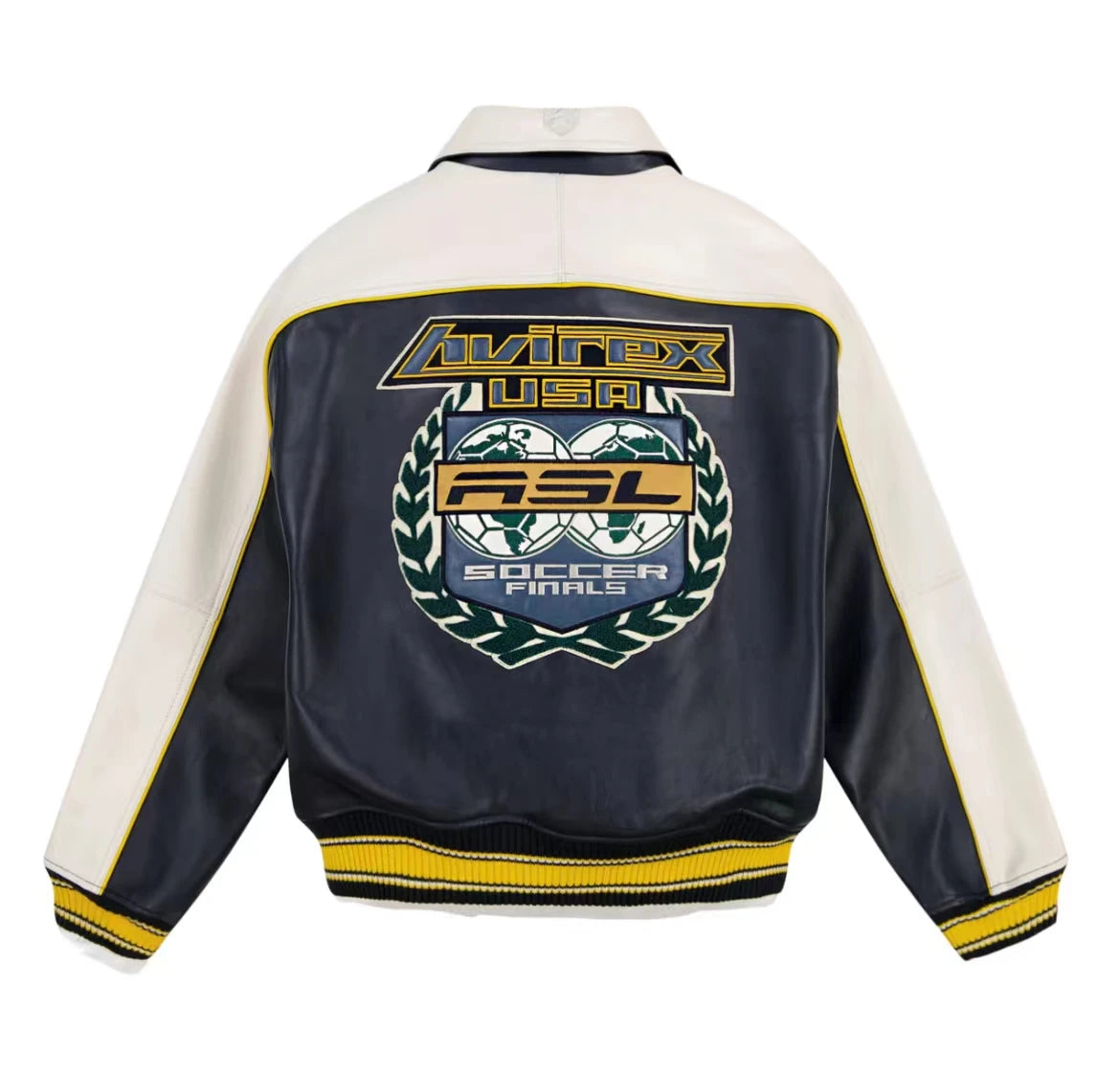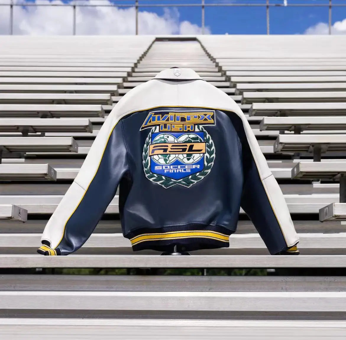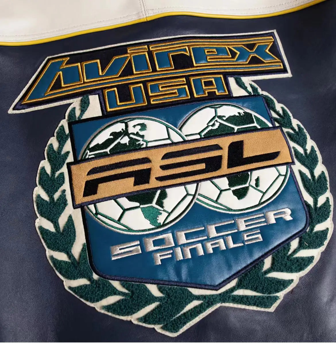 Avirex soccer jacket in 100% leather with soccer emblem at front, and suede and patent leather patch set at back.
