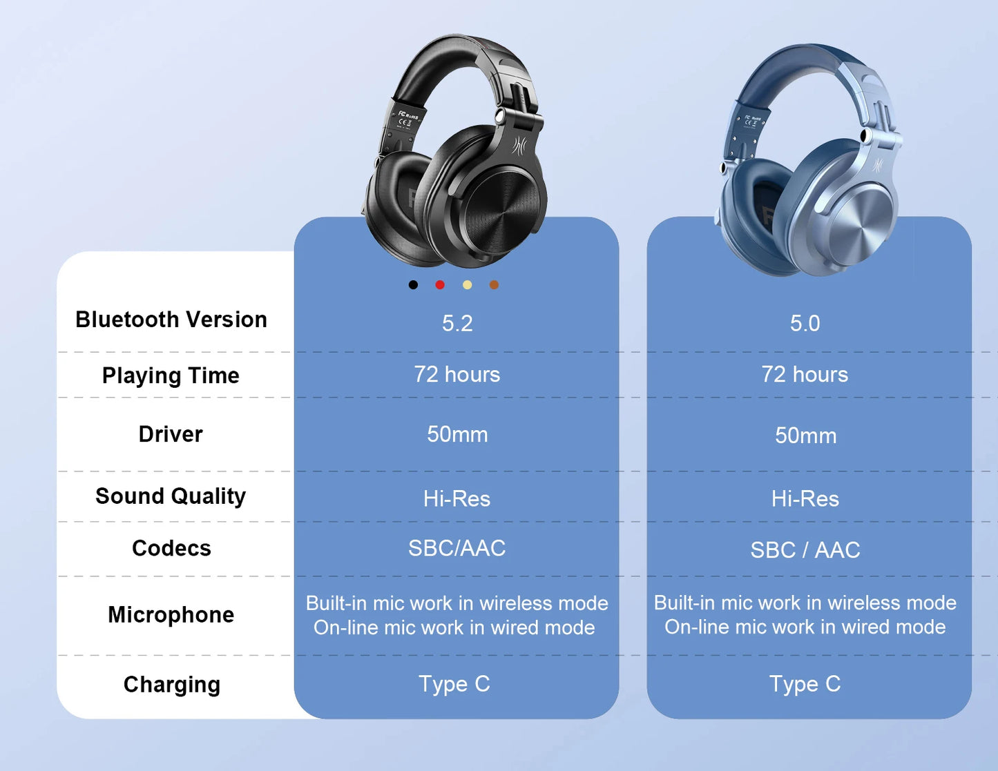 Oneodio A70 Wireless Bluetooth 5.2 Headphones 72Hrs Over Ear Hi-Res Audio 3.5mm/6.35mm Wired Studio DJ Headset With Microphone