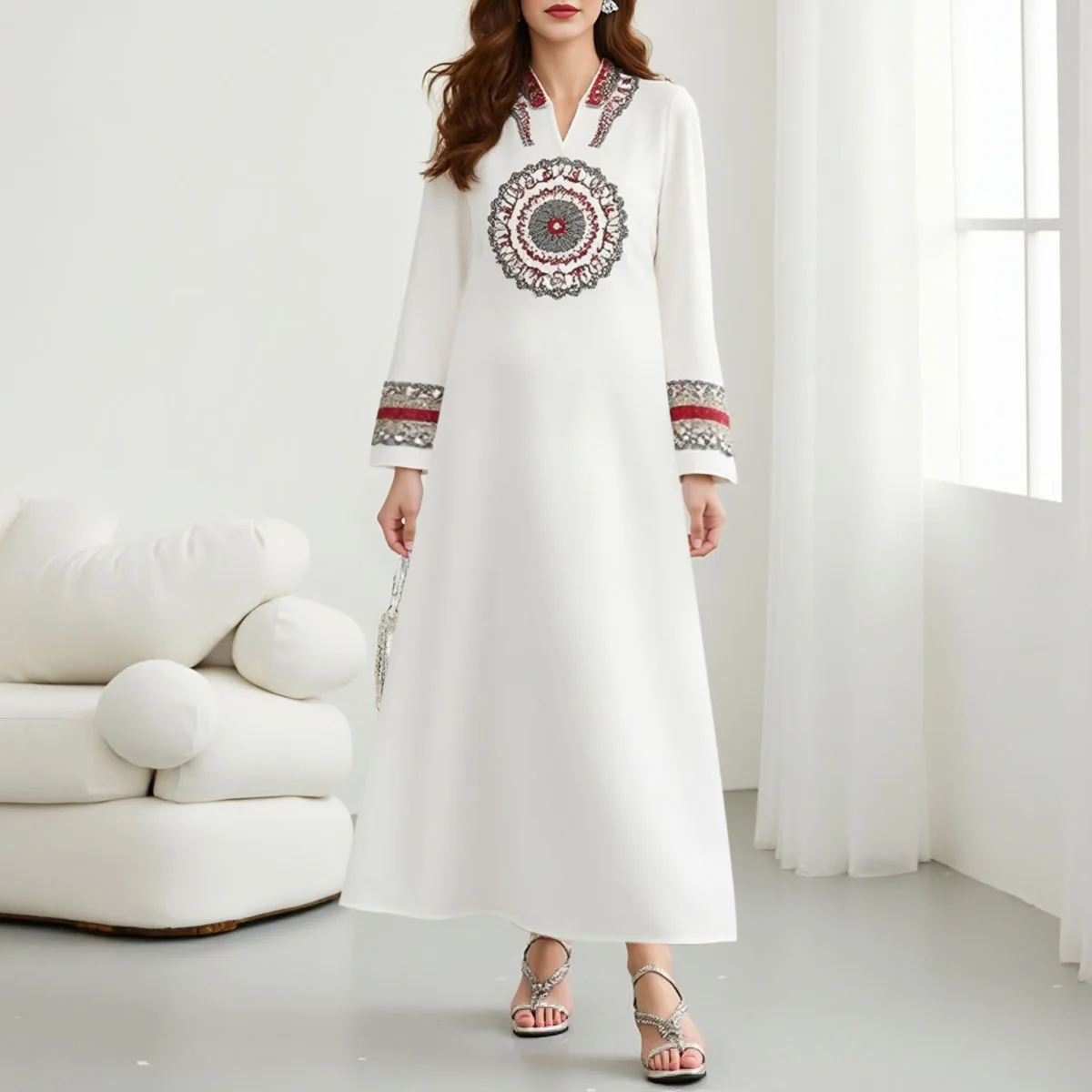 Rafiah Autumn Dresses 2025 Women's Elegant Print Long Sleeve V-Neck A-Line Dating Long Arabian Dresses