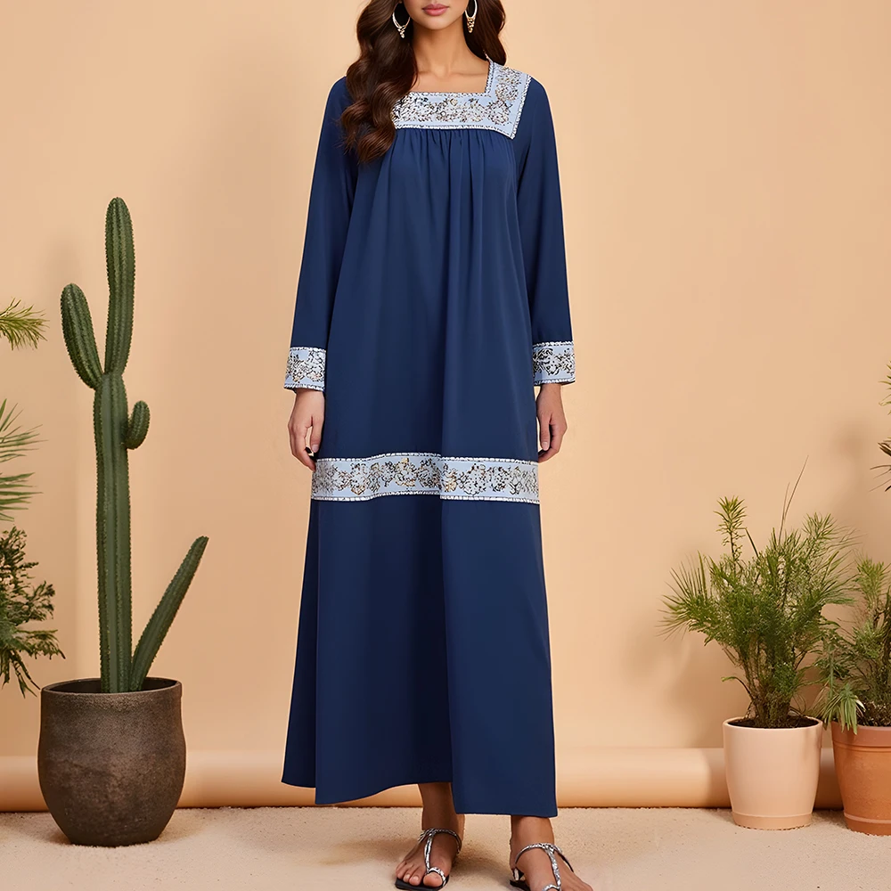 Rafiah Summer Long Arabian Dress 2025 Casual Daily Contrast Color Long Sleeve Square Neck Midi Loose Fit Dresses