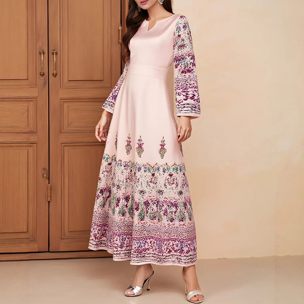 Rafiah Women's Dresses Summer Elegant Decent Fashion 2025 Traditional Print Long Sleeve V-Neck Maxi A Line Casual Long Dress