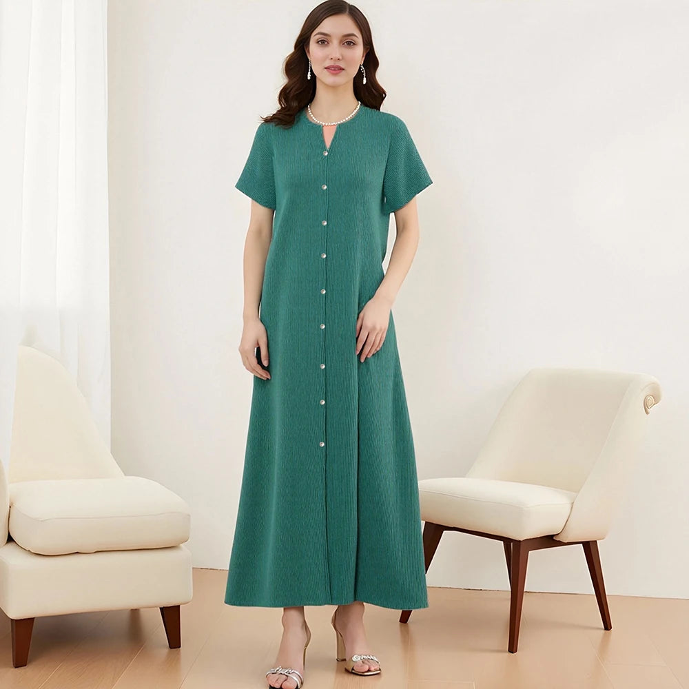 Rafiah Women's Summer 2025 Dress Solid Color V-Neck Button-Front Short Sleeves Minimalist Detailing Long Dress