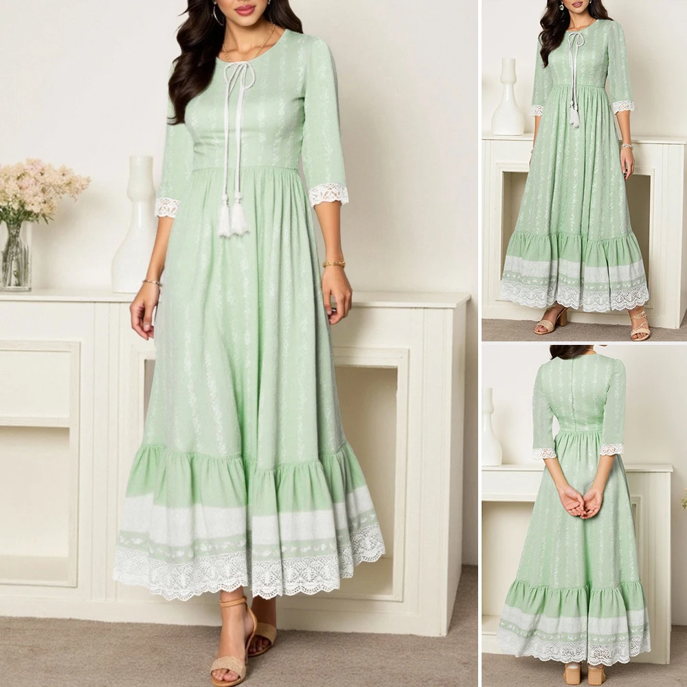 Rafiah Women's Summer Arabian Dress Loose Fit Comfortable Lace Shirring Lace-Up 3/4 Sleeve Crew Neck Midi Casual Arabian Dress