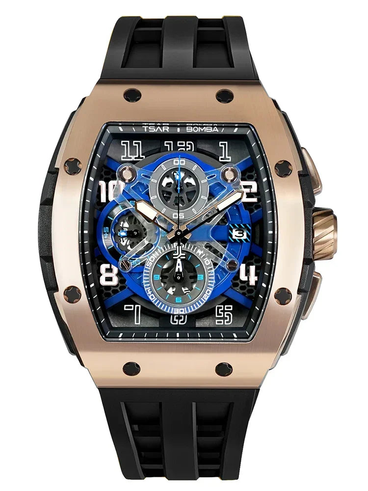 TSAR BOMBA Luxury Mens Watch Top Brand Wristwatch Tonneau Clock Rubber Strap Chronograph Sapphire Watches for Men